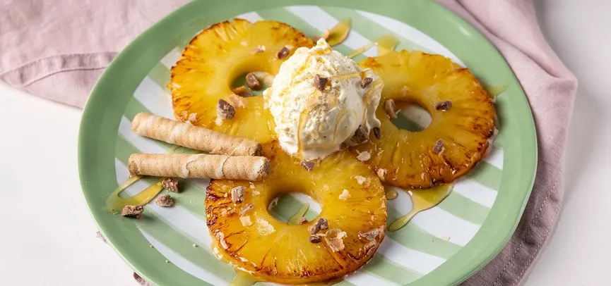 Wenn du noch nie eine Ananas auf den Grillrost gelegt hast, solltest du das bei deiner nächsten Grillerei unbedingt ausprobieren! Die gegrillte Ananas entwickelt ein intensives, süßes Aroma und sorgt in Kombination mit cremigem Eis für eine Geschmacksexplosion. Mit nur vier clever Zutaten zauberst du dieses schnelle und unkomplizierte Dessert.