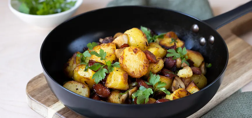 Ein deftiges Pfannengericht darf in diesem Wochenplan natürlich nicht fehlen! Die knusprig gebratenen clever Erdäpfel mit würzigen clever Cabanossi schmecken immer und allen. Dieses Rezept eignet sich auch hervorragend, um deine Gemüsereste aus dem Kühlschrank zu verwerten - einfach mit in die Pfanne geben! Einfach, herzhaft, clever und nur 1 € pro Portion!