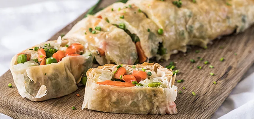 Der knusprige Gemüsestrudel ist ein leichtes und mit Gemüse vollgepacktes Gericht. Zusammen mit einem Dip aus Joghurt und Kräutern schmeckt er am besten! Für 1 € pro Portion passt dieser Strudel perfekt in einen ausgewogenen Speiseplan.