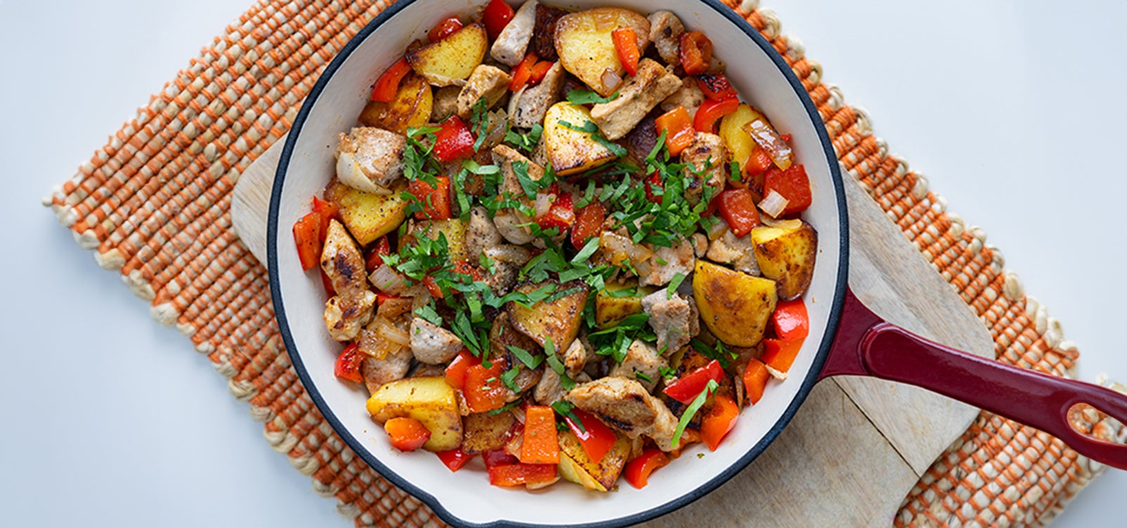 Ein Gericht für alle, die es deftig mögen! In dieser Pfanne treffen zarte Schweinefleischstücke auf knusprige Kartoffeln und buntes Gemüse. Alles wird gemeinsam angebraten - das spart Zeit und schmeckt richtig gut. Ideal für ein schnelles Mittag- oder Abendessen! Dank der clever Kartoffeln wird aus diesem einfachen Gericht eine garantiert günstige Köstlichkeit, die mit Qualität und Geschmack überzeugt.