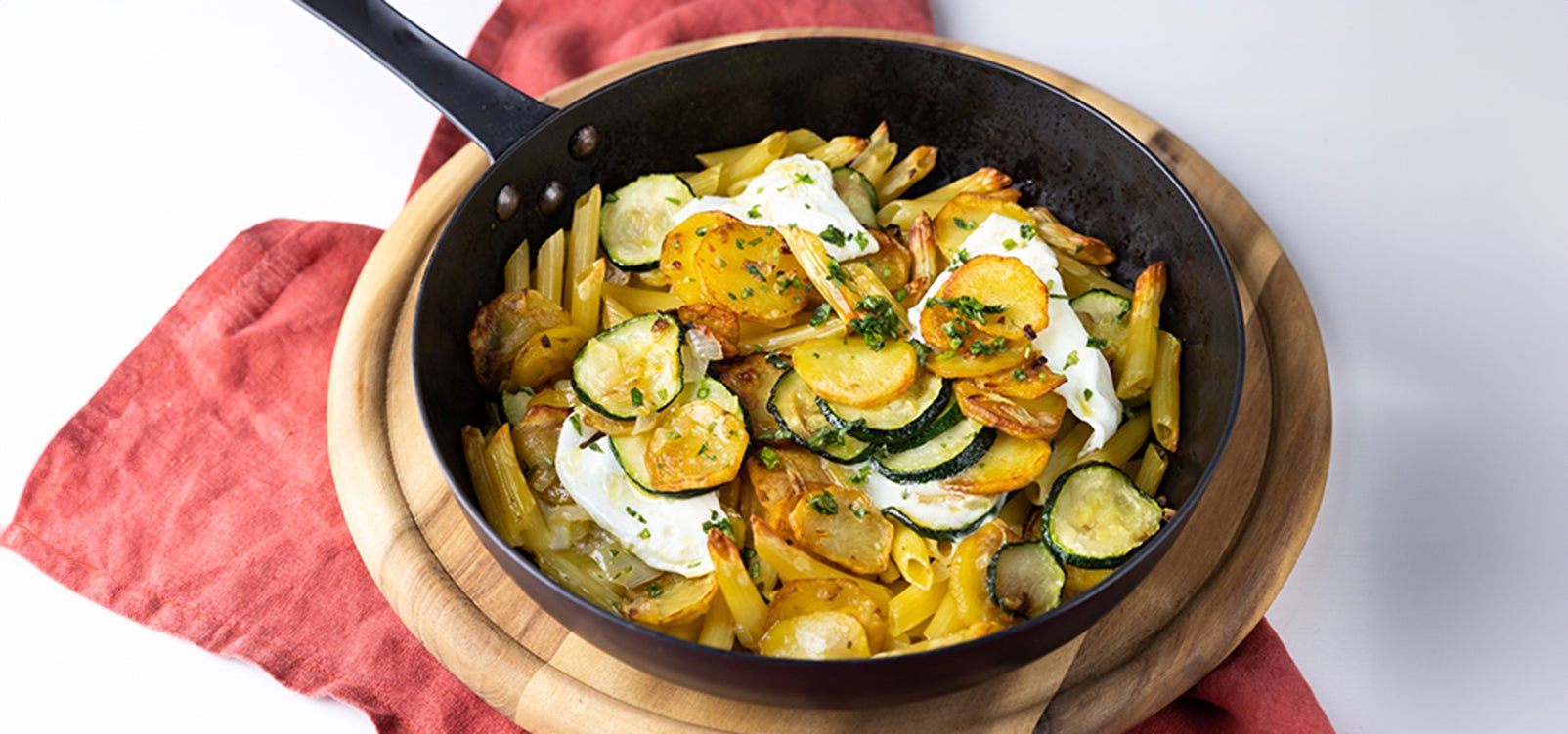 Auch wenn die Kartoffeln hier nicht die Hauptrolle spielen, sind sie eine tolle Ergänzung zu Pasta und Gemüse. Die Pfanne ist bunt und schnell gemacht. Ein perfektes Rezept, für alle die gerne abwechslungsreich essen und trotzdem nicht lange in der Küche stehen wollen. Entdecke die Zutaten für dieses Gericht im breiten clever Sortiment mit rund 1.000 garantiert günstigen Produkten.