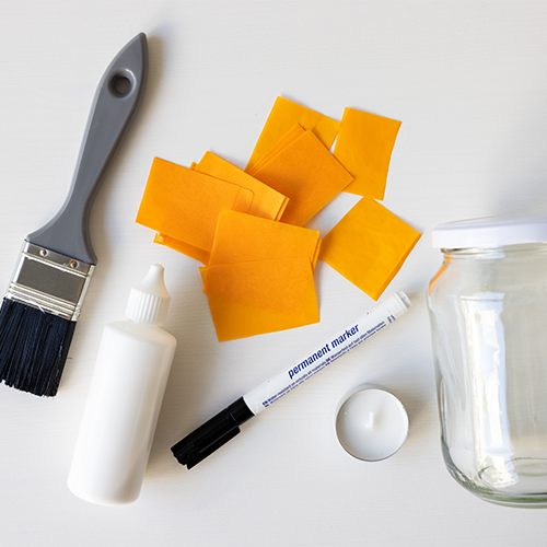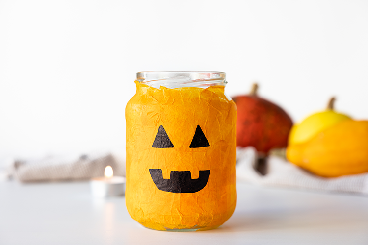 - Zuletzt ein Teelicht in das Glas geben und fertig ist deine selbstgemachte Halloween-Deko.