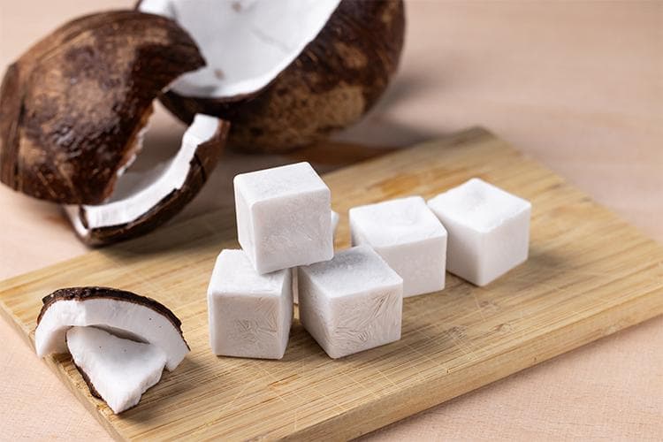 - Wenn du wieder Kokosmilch zum Kochen benötigst, die Eiswürfelformen aus dem Gefrierfach nehmen, die Kokosmilch-Eiswürfel aus den Formen drücken und erhitzen.