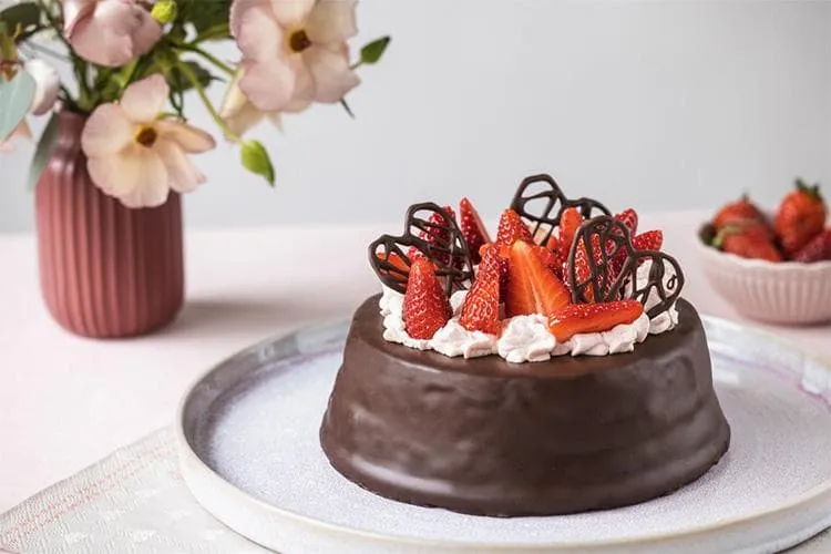 - Das Schlagobers auf die aufgetaute clever Sachertorte spritzen und die Erdbeeren darauf platzieren.