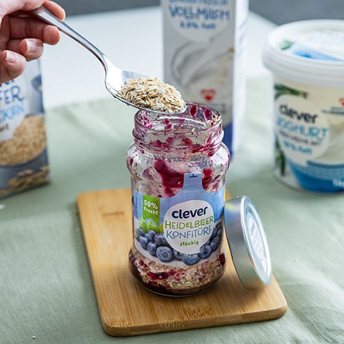 - Zu den Resten im Glas Haferflocken geben, mit Milch auffüllen und etwas griechisches Joghurt dazugeben.
