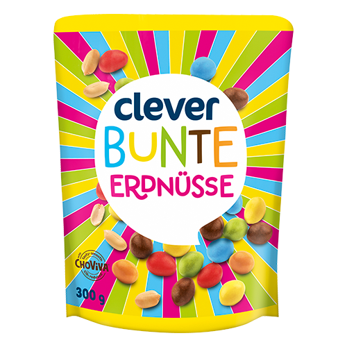 Die clever Bunte Erdnüsse sind ein farbenfroher Knabberspaß für zwischendurch. Die knackigen Erdnüsse in einer bunten Hülle schmecken Groß und Klein!
