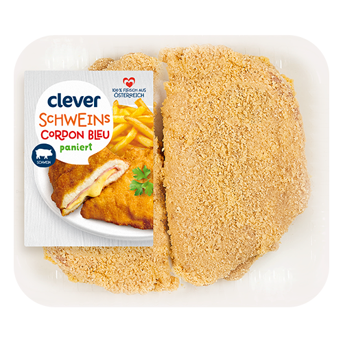 Das clever Schweins Cordon Bleu mit 100% Fleisch aus Österreich ist mit Toastschinken und Käse gefüllt sowie fertig paniert. Ideal für die Zubereitung in der Pfanne, Fritteuse, dem Backofen oder Air Fryer.