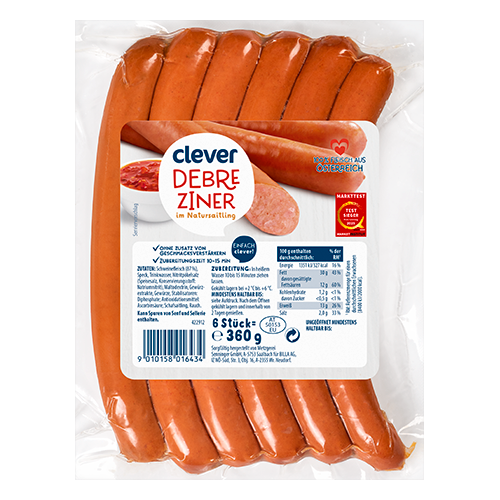 Zutaten: Schweinefleisch (87%), Speck, Trinkwasser, Nitritpökelsalz (Speisesalz, Konservierungsstoff: Natriumnitrit), Maltodextrin, Gewürzextrakte, Gewürze, Stabilisatoren: Diphosphate; Antioxidationsmittel: Ascorbinsäure, Schafsaitling, Rauch.