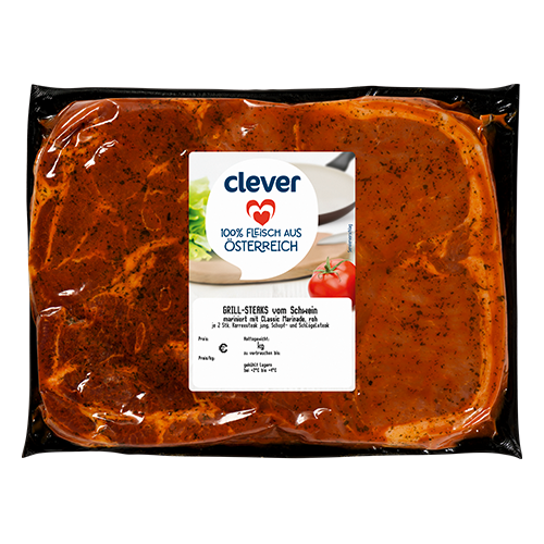 Die marinierten clever Grill-Steaks lassen das Herz aller Grillbegeisterten höher schlagen. Sie bestehen aus je zwei Stück jungem Karreesteak, Schopfsteak und Schlögelsteak. Das Fleisch kommt zu 100% aus Österreich.
