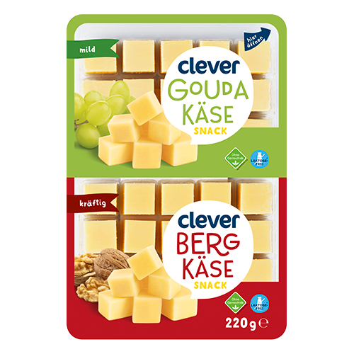 Gouda 48% Fett i.Tr., gewürfelt, Bergkäse 45% Fett i.Tr., gewürfelt.