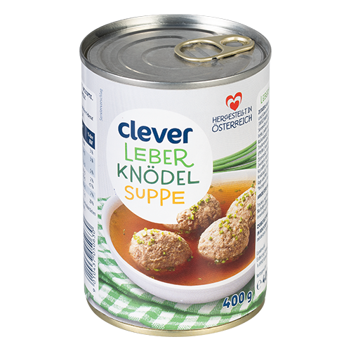 Inhaltsstoffe: Wasser, 33 % Leberknödel [42 % Rinder- und Schweineleber*, Wasser, Semmelwürfel (WEIZENMEHL, Speisesalz, Hefe), Speck, Semmelbrösel (WEIZENMEHL, Wasser, Speisesalz, Hefe), jodiertes Speisesalz (Speisesalz, Kaliumiodid), Kräuter (Petersilie, Majoran), Trockenzwiebel, VOLLEIPULVER, Gewürze (Pfeffer), Knoblauchgranulat], gekörnte Rindsuppe (Speisesalz, Hefeextrakt, Rindfleischextrakt, Zwiebeln, Karotten, Sonnenblumenöl, Kartoffeln, Tomaten, Lauch, SELLERIE, Petersilie,