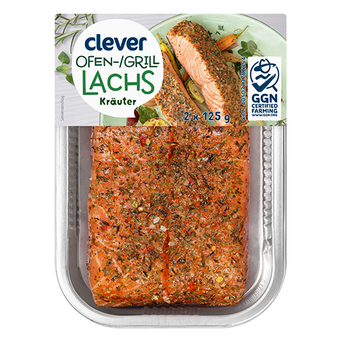 Heizen Sie den Ofen auf 200 °C (Ober-Unterhitze) vor. Legen Sie die Aluschale in den Ofen und garen Sie die Lachsportionen für mind. 20 Minuten.