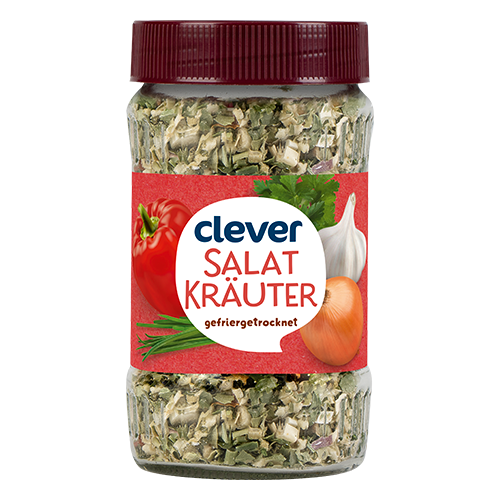 Die clever Salatkräuter mit Zwiebeln, Paprika und Knoblauch sind küchenfertig, aromatisch und das ganze Jahr über einsetzbar. Ideal für Salate, Dressings und Dips.