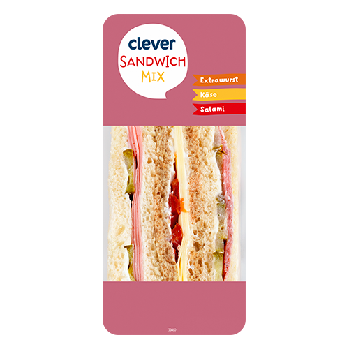 Zutaten: Weizenbrot (WEIZENMEHL, Wasser, Hefe, Speisesalz, Sonnenblumenöl, Zucker, WEIZENGLUTEN, ROGGENMEHL, SOJAMEHL, Säureregulatoren: Milchsäure, Essigsäure; Emulgator: Mono- und Diglyceride von Speisefettsäuren), Weizenbrot mit 23% Vollkornanteil (WEIZENMEHL, Wasser, WEIZENVOLLKORNMEHL, Speisesalz, Hefe, WEIZENGLUTEN, ROGGENQUELLMEHL, ROGGENMEHL, SOJAMEHL, SÜSSMOLKENPULVER, Säureregulatoren: Essigsäure, Milchsäure; Emulgator: Natriumstearoyl-2-lactylat; Gewürze), Rapsöl, 9%* KÄSE, 9%* Extrawurst [Schweine- und Rindfleisch, Wasser, Speck, Nitritpökelsalz (Speisesalz, Konservierungsstoff: Natriumnitrit), Kartoffelstärke, Gewürzextrakte, Stabilisator: Diphosphate; Gewürze, Dextrose, Zucker, Antioxidationsmittel: Ascorbinsäure], 7%* Salami (Schweinefleisch, Speck, Speisesalz, Konservierungsstoff: Natriumnitrit; Gewürze, Dextrose, Glukosesirup, Antioxidationsmittel: Natriumascorbat; Gewürzextrakte, Reifekulturen, Buchenholzrauch), Essiggurken (Gurken, Weingeistessig, Zucker, Speisesalz), Wasser, Paprika, Zucker, Weingeistessig, EIGELBPULVER, modifizierte Stärke, Speisesalz, Kräuter, Dextrose, SENFKORN gemahlen, Zitronensaftkonzentrat, Gewürze, Säuerungsmittel: Milchsäure; Säureregulatoren: Natriumacetat, Natriumcarbonat; Verdickungsmittel: Xanthan, Guarkernmehl, Johannisbrotkernmehl.