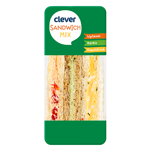 Zutaten: Weizenbrot (WEIZENMEHL, Wasser, Hefe, Speisesalz, Sonnenblumenöl, Zucker, WEIZENGLUTEN, ROGGENMEHL, SOJAMEHL, Säureregulatoren: Milchsäure, Essigsäure; Emulgator: Mono- und Diglyceride von Speisefettsäuren), Weizenbrot mit 23% Vollkornanteil (WEIZENMEHL, Wasser, WEIZENVOLLKORNMEHL, Speisesalz, Hefe, WEIZENGLUTEN, ROGGENQUELLMEHL, ROGGENMEHL, SOJAMEHL, SÜSSMOLKENPULVER, Säureregulatoren: Essigsäure, Milchsäure; Emulgator: Natriumstearoyl-2-lactylat; Gewürze), TOPFEN, 8%* Frischkäsezubereitung (MILCH, Speisesalz, Säuerungskulturen, mikrobielles Lab, Verdickungsmittel: Guarkernmehl), Wasser, 7%* EISCHEIBEN gekocht, Rapsöl, 4%* EIER gekocht, Paprika, BUTTER, 1%* HÜHNEREIEIWEISS gekocht, Rahmzubereitung (RAHM, Speisegelatine), Zucker, 1%* Kürbiskerne geröstet gehackt, Weingeistessig, Essiggurken (Gurken, Weingeistessig, Zucker, Speisesalz), 0,5%* Kürbiskernöl, Speisesalz, Rucola, Zwiebel, modifizierte Stärke, SENFKORN gemahlen, Kapern, Speisegelatine, Gewürze, Dextrose, EIGELBPULVER, Tomatenmark, Kräuter, Paprikagranulat, Konservierungsstoff: Kaliumsorbat; Farbstoff: Carotin; Säuerungsmittel: Milchsäure; Säureregulatoren: Natriumacetat, Natriumcarbonat; Verdickungsmittel: Xanthan, Guarkernmehl, Johannisbrotkernmehl.