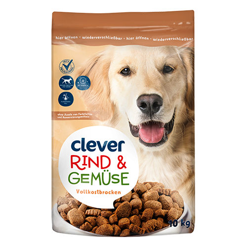 Das clever Hunde Trockenfutter Rind & Gemüse Vollkostbrocken ist ein Alleinfutter für Hunde und bietet eine ausgewogene Mahlzeit. Das Trockenfutter enthält Vitamin A und sorgt für gesunde Gelenke, Knochen und Zähne und ein glänzendes Fell.