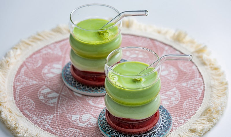 Den Matcha vorsichtig über die Himbeerschicht gießen.