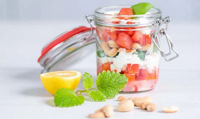 Cottage Cheese, Melone, Cashews und Minze jeweils in Gläser schlichten und Öl und Essig, sowie den Zitronensaft darüber geben.