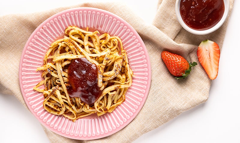 Die Pancake Spaghetti am Teller anrichten, Erdbeerkonfitüre darüber geben und genießen.
