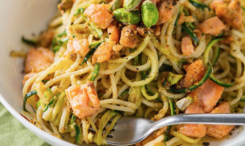 Zucchini Nudeln mit Lachs und Pistazien Pesto
