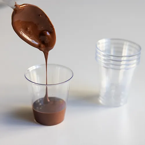 - Sobald die Schokolade komplett zerschmolzen ist, diese auf kleine Plastik-Schnapsgläser verteilen. Es können aber auch kleine Eiswürfelbehälter oder Silikon-Pralinenformen dafür verwendet werden.