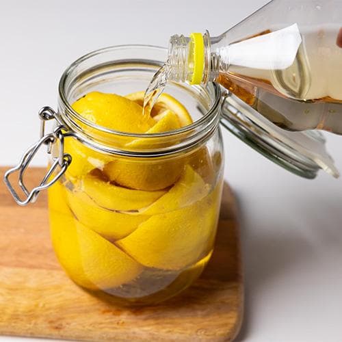 - Anschließend für 2-3 Wochen ziehen lassen. Gelegentlich Essig nachgießen, damit die Zitronenschalen immer vollkommen bedeckt sind.